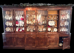 Temple Incense Burner Signed & Dated 1820; Herend Rothschild Bird Full Dinner Service with tea & coffee set, serving pieces, napkin rings, candelabra, tureens, etc.; Lenox “Westchester” dinner service; a set of Christian Lacroix “Five Continents” dessert plates; Royal Worcester “Holly Ribbon” service for 10; Limoges oyster plates; Chinese blue & white vases with double handles, 23" tall; Late 18th early 19th Century Chinese export vases; Rose Medallion; Large collection of blue & white Chinese Export; a Fine Collection of Japanese Kutani-ware; Staffordshire; Imari vases, plates, and bowls; Dresden porcelain figurines; Bohemian Moser glass; Mason’s Stoneware; Versace Rosenthal dessert plates, cups & saucers, and Christmas plates; Japanese Royal Satsuma platters, bowls, and vases;